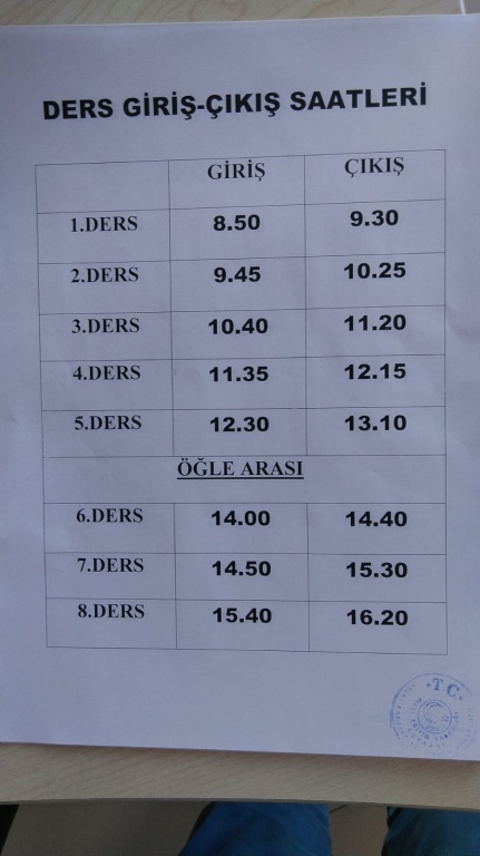 OKULUMUZUN DERS GİRİŞ VE ÇIKIŞ SAATLERİ
